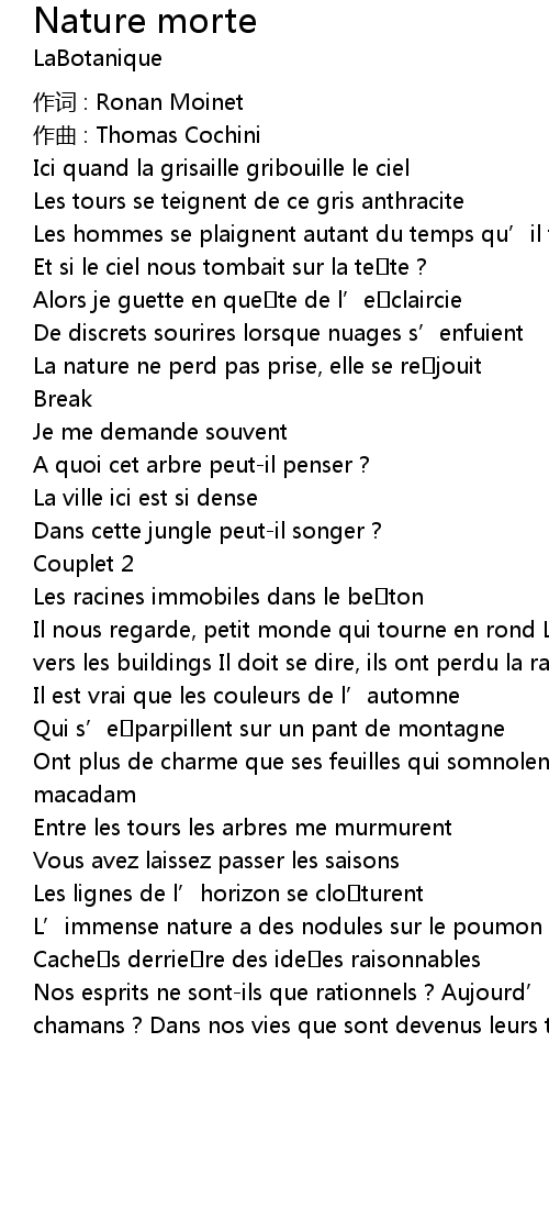 | Il nous regarde, petit monde qui tourne en rond Les lourdes branches qui filent vers les buildings Il doit se dire, ils ont perdu la raison | |
