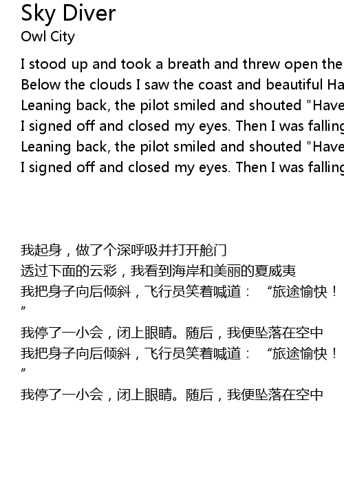 | [00:58.25] | 我把身子向后倾斜,飞行员笑着喊道: “旅途愉快! ” |