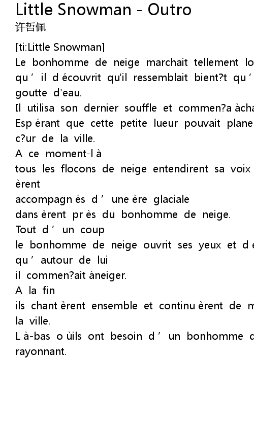 | [01:00.411] | L à-bas o ùils ont besoin d ’un bonhomme de neige rayonnant. |