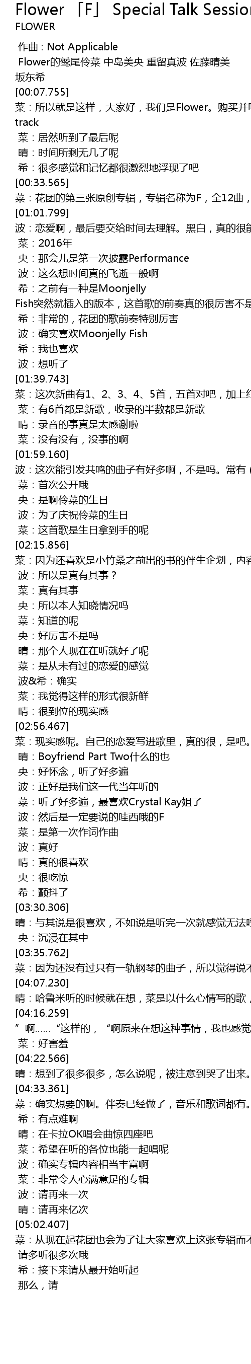 | [03:35.762] | 菜:因为还没有过只有一轨钢琴的曲子,所以觉得说不定反而效果会很好。一上来就是全部是钢琴,还是现场演奏,请听一听。歌词也是把恋爱的部分都去掉了,因为果然最重要的,专辑标题是F。一直以来的花团也好,从今往后的花团也好,虽然是有些伤感的毕业曲风格,想表现一路走来的同伴的长此以往,所以写了这样的歌词 |