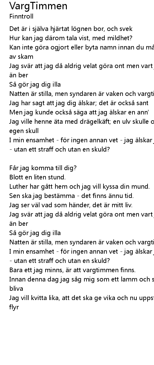 | Bara ett jag minns, r att vargtimmen finns. x2 | |