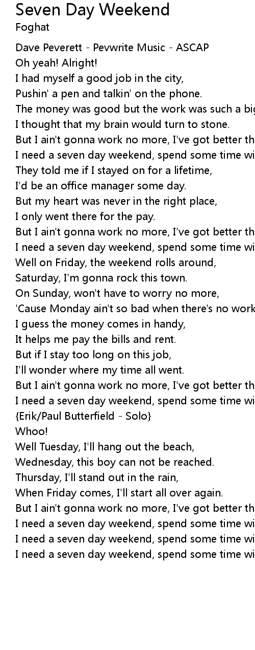 I need a seven day weekend, spend some time with you, Oh yeah. |