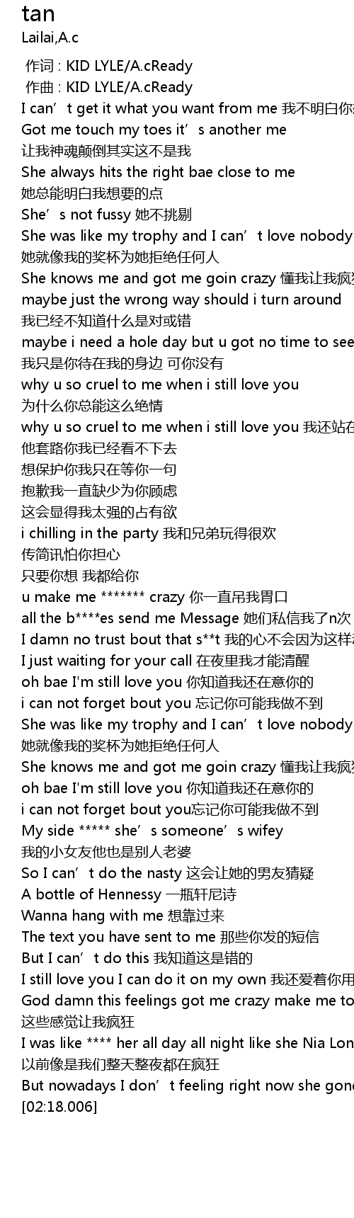 | [01:07.050] | u make me ******* crazy 你一直吊我胃口 |