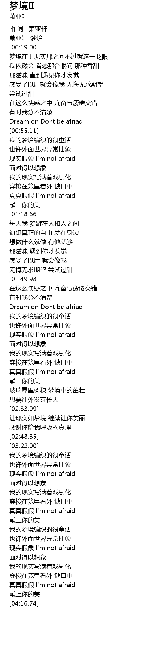 | [03:58.46] | xiàn shí jiǎ xiàng I' m not afraid |