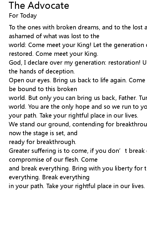 | world: Come meet your King! Let the generation of the brokenhearted be restored. Come meet your King. | |