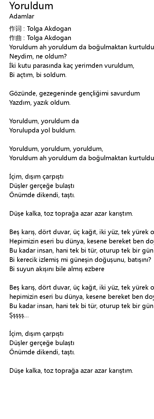 | Yoruldum ah yoruldum da bo ulmaktan kurtuldum | |