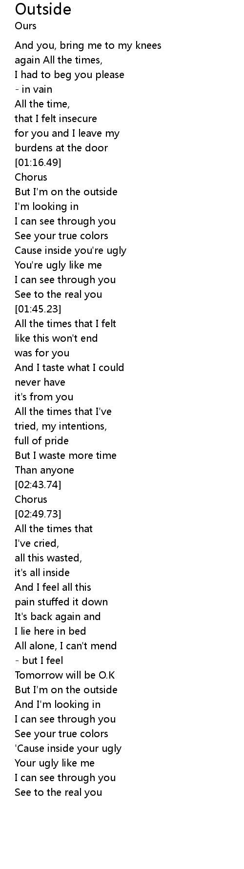 | [01:20.26] | But I'm on the outside |