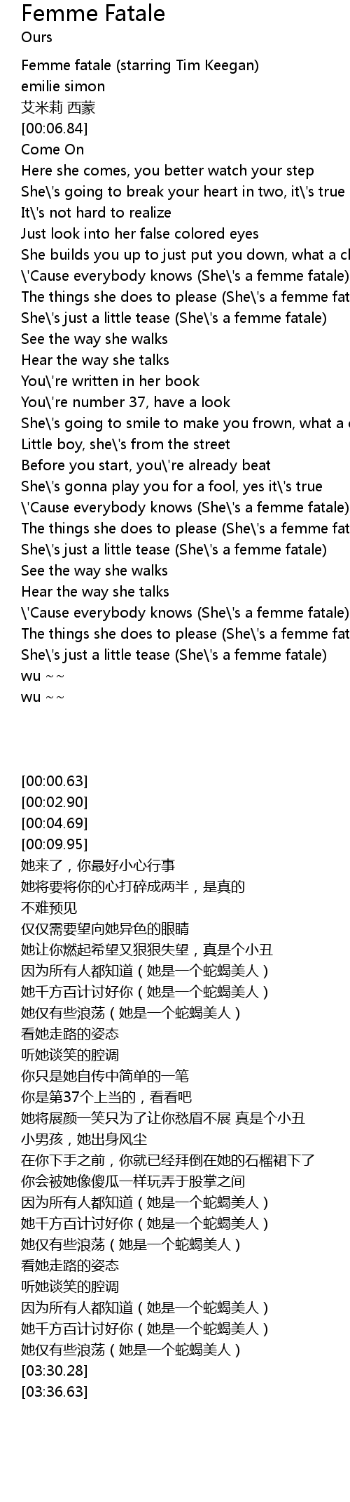 | [03:09.03] | ' Cause everybody knows She' s a femme fatale |