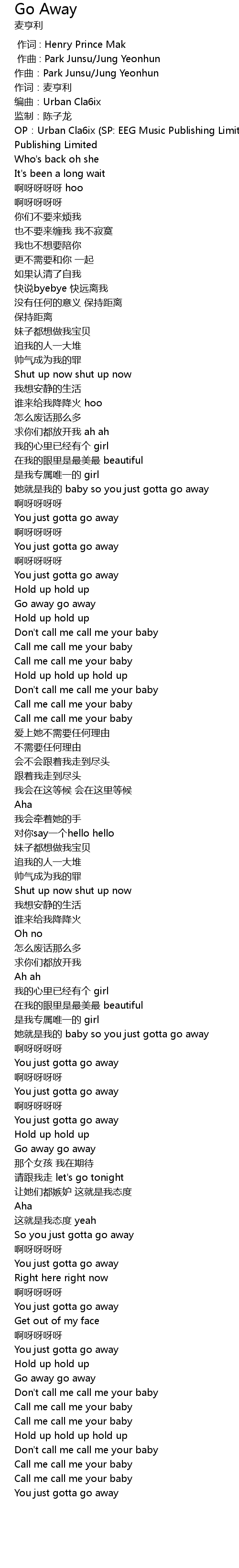 | [02:21.91] | 她就是我的 baby so you just gotta go away |