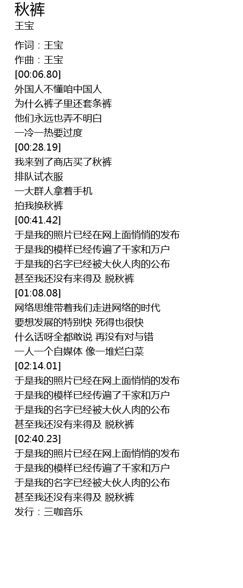 | [00:28.48] | 我来到了商店买了秋裤 |