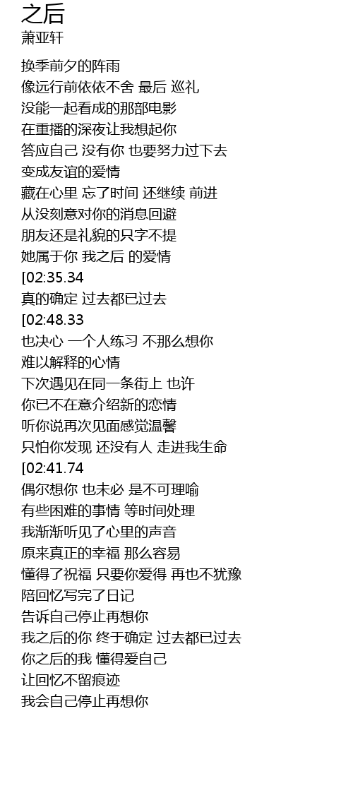 | [03:47.63][02:48.33][01:42.51] | 你之后的我 比较爱自己 |