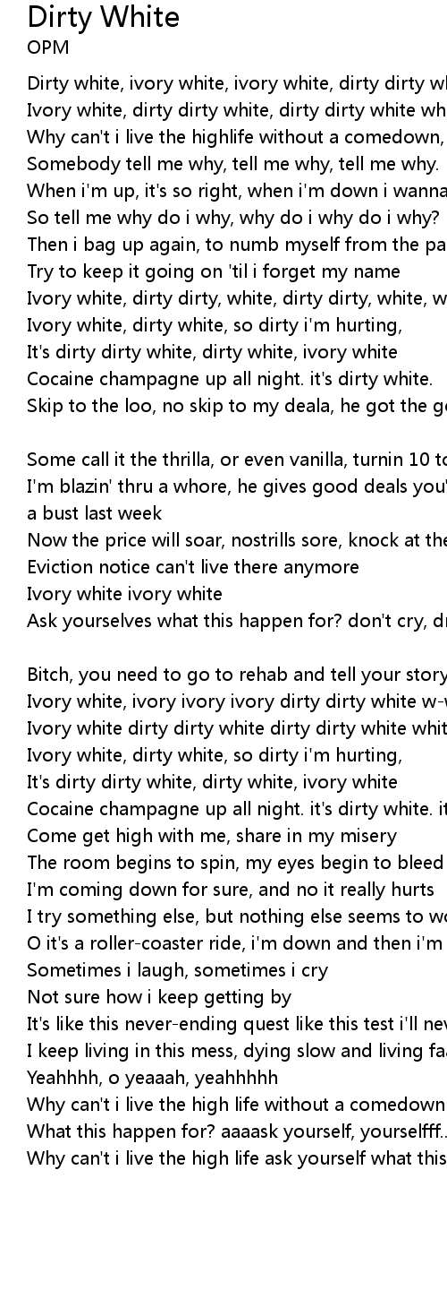| Cocaine champagne up all night. it's dirty white. it's dirty white. | |
