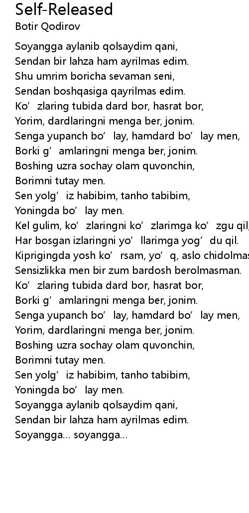 | [00:58.38] | Yorim, dardlaringni menga ber, jonim. |