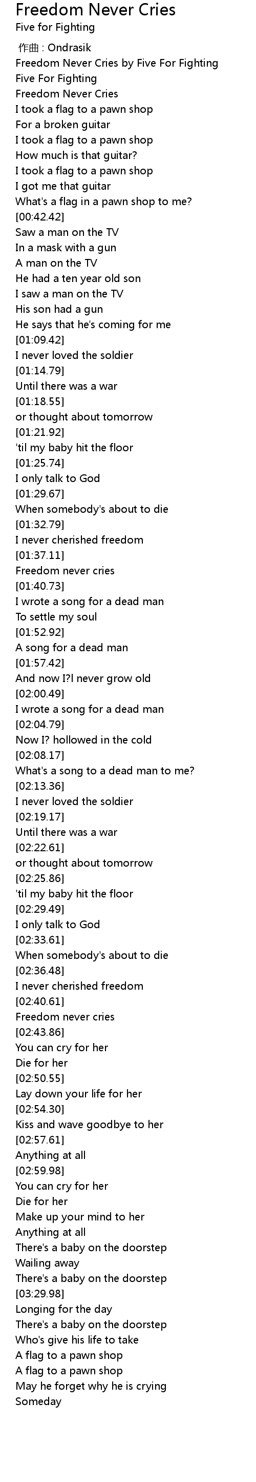 | [00:11.73] | Freedom Never Cries by Five For Fighting |