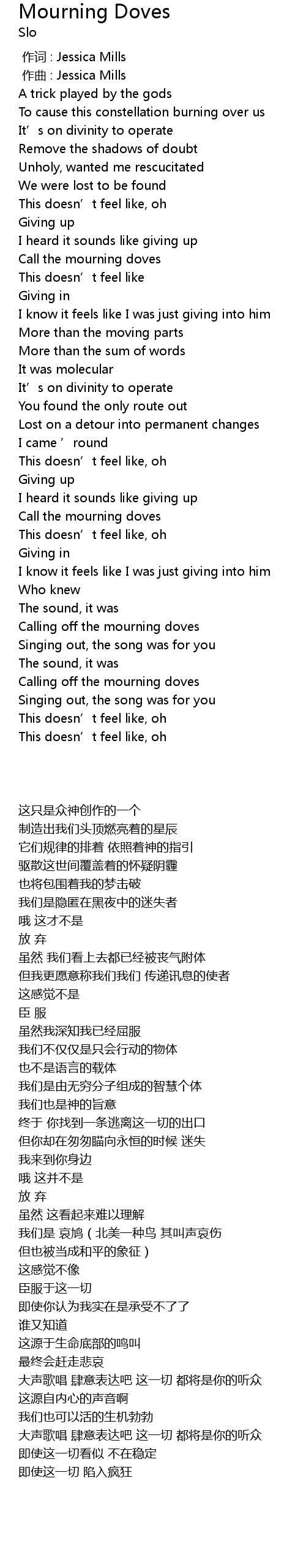 | [01:54.90] | 我们是 哀鸠(北美一种鸟 其叫声哀伤 但也被当成和平的象征) |
