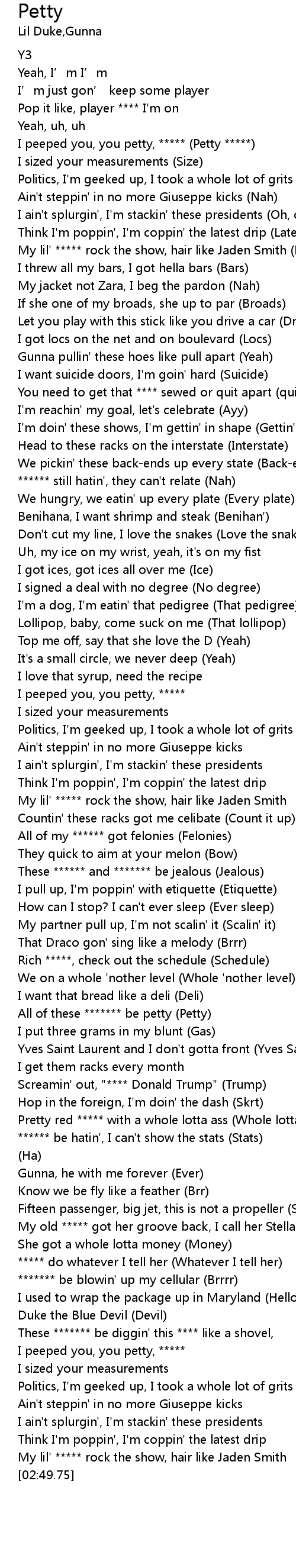 | [01:53.29] | All of these ******* be petty (Petty) |