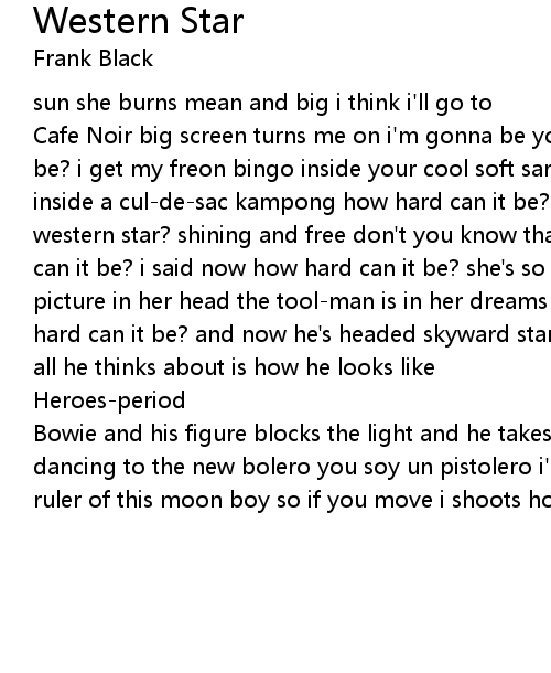 Cafe Noir big screen turns me on i'm gonna be your western star how hard can it be? i get my freon bingo inside your cool soft sarong rolling on the moquette inside a cul-de-sac kampong how hard can it be? how hard can it be when you're a western star? shining and free don't you know that a star burns best? how hard can it be? i said now how hard can it be? she's so sentimental she's got my picture in her head the tool-man is in her dreams i was lifted when she said how hard can it be? and now he's headed skyward standing up on piles of plywood and all he thinks about is how he looks like |