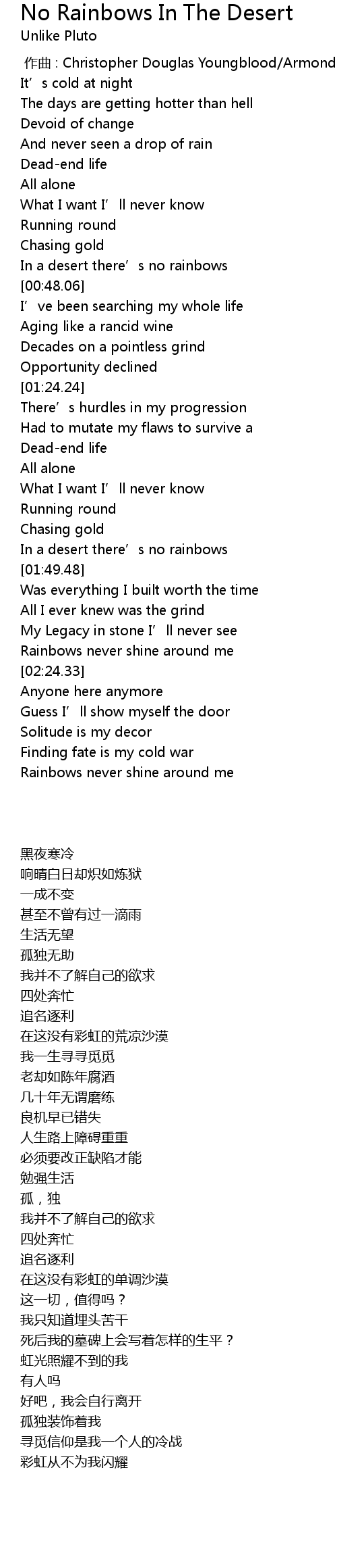 | [00:44.01] | 在这没有彩虹的荒凉沙漠 |