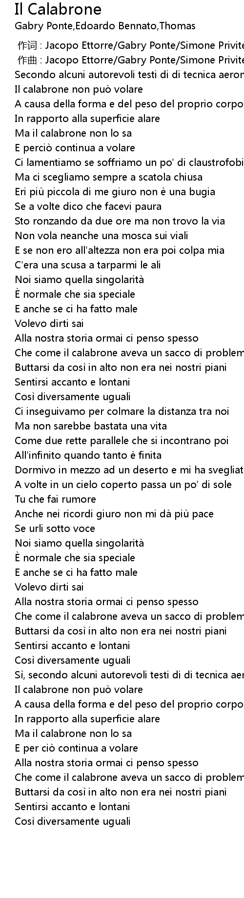 | [02:05.273] | Che come il calabrone aveva un sacco di problemi ma volava lo stesso |