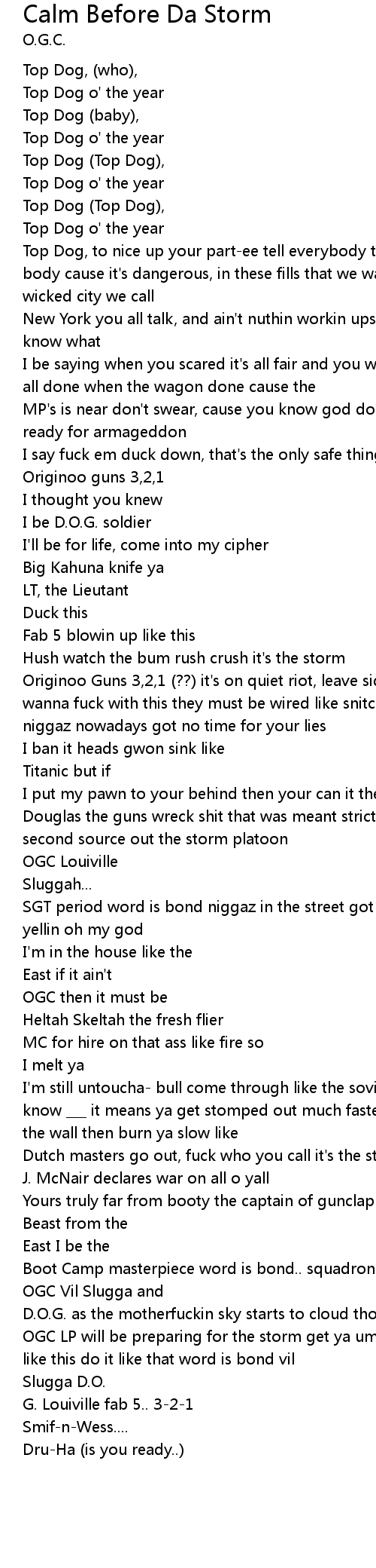 | Top Dog, to nice up your part-ee tell everybody to leave they shorty shake they body cause it's dangerous, in these fills that we walk it's a rap race in this wicked city we call | |