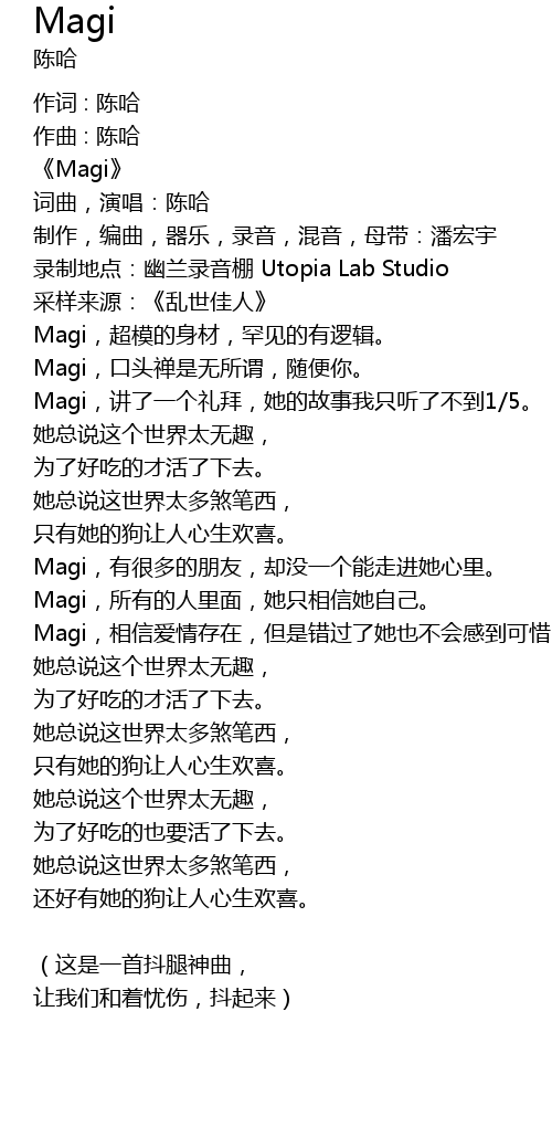 | Magi,讲了一个礼拜,她的故事我只听了不到1/5。 | |