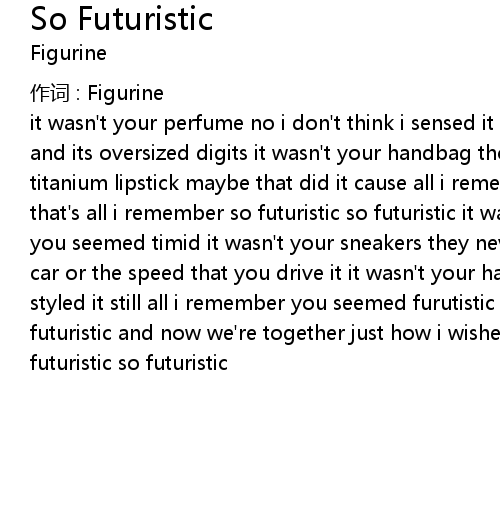 | it wasn' t your perfume no i don' t think i sensed it it wasn' t your wristwatch and its oversized digits it wasn' t your handbag though i don' t think you hid it titanium lipstick maybe that did it cause all i remember you seemed futuristic that' s all i remember so futuristic so futuristic it wasn' t your posture i think you seemed timid it wasn' t your sneakers they never quite fit it it wasn' t your car or the speed that you drive it it wasn' t your haircut or they way that you styled it still all i remember you seemed furutistic you' d stolen my heart so futuristic and now we' re together just how i wished it together forever so futuristic so futuristic |