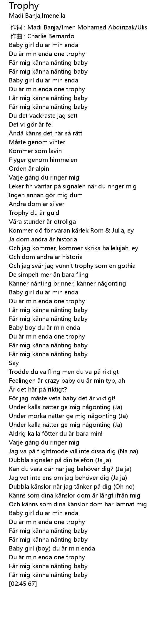 | [02:33.67] | Baby girl (boy) du är min enda |