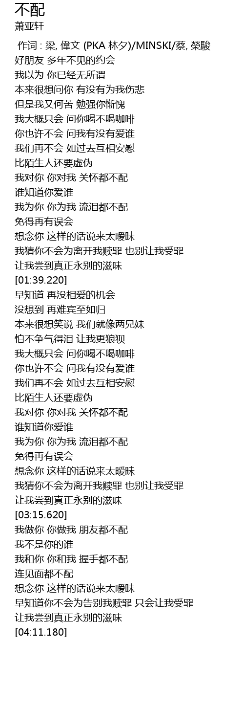 | [00:00.00] | 作词 : 梁, 偉文 (PKA 林夕)/MINSKI/蔡, 榮駿 |