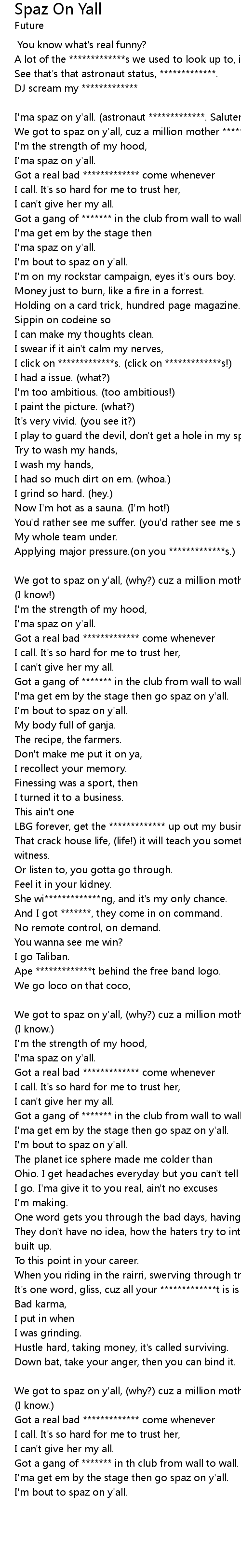 We got to spaz on y'all, (why?) cuz a million mother *******s wanna see me fall. (I know.) |