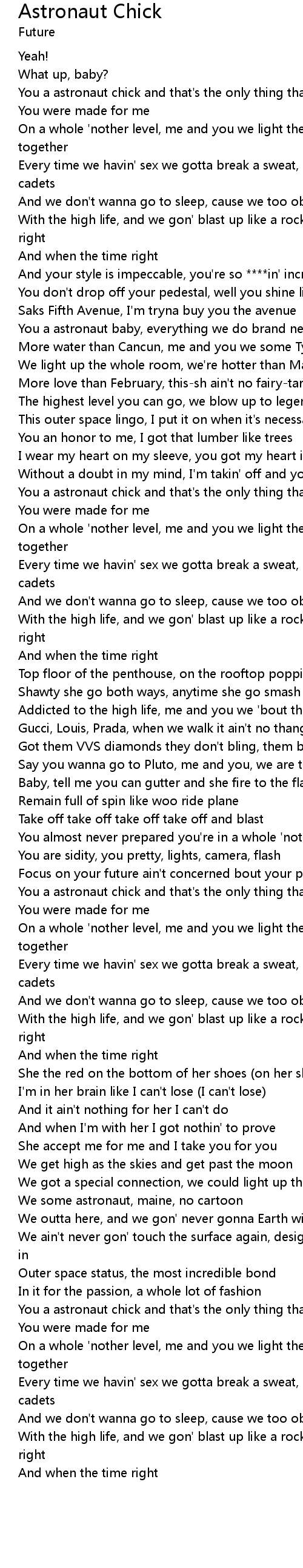 | [00:11.17] | You a astronaut chick and that's the only thing that matter to me |