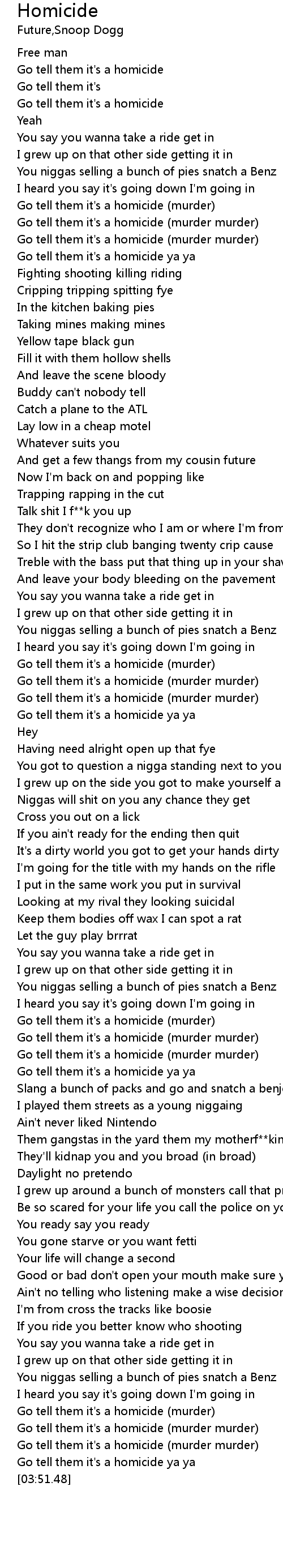 | [03:47.35] | Go tell them it's a homicide ya ya |