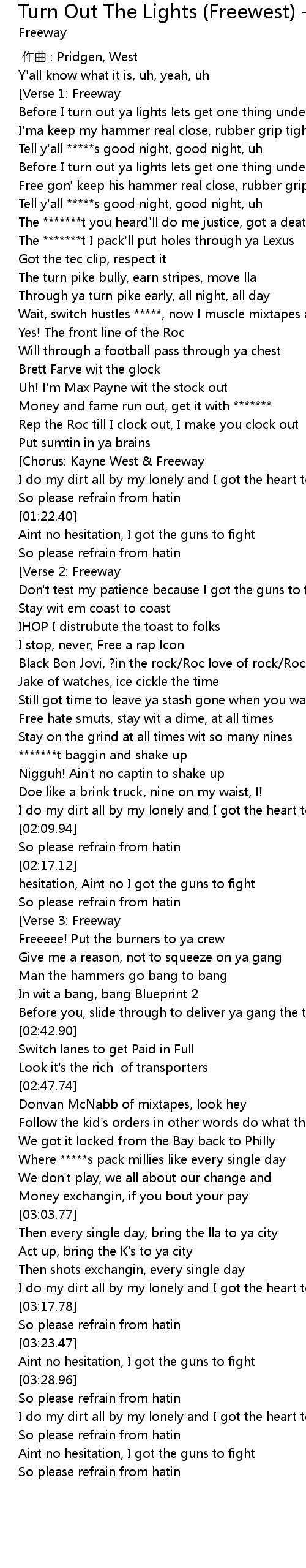 | [01:11.96][Chorus: Kayne West & Freeway] | |