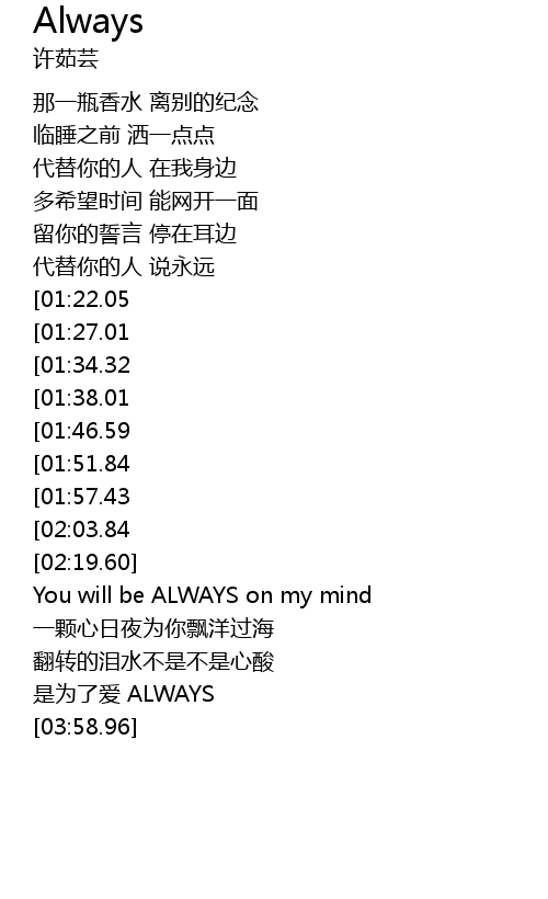 | [03:03.35][01:46.59] | You will be ALWAYS on my mind |