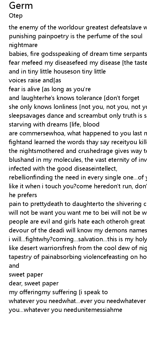 the enemy of the worldour greatest defeatslave warfareour wings are almost dry and freeabsorbing violence [pain]punishing painpoetry is the perfume of the soul [no fear, no god, alternatestaces take meplaces, the world, enemy]nightmare babies, fire godsspeaking of dream time serpantsand walking with the elder deadfear me mortal [fear me]fear mefeed my diseasefeed my disease [the taste of fear in the seventh phase of thedisease]and in tiny little houseson tiny little streets [everythings normal, everythings not ok,it's normal]voices raise and[as long as you're under my roof you willrespect me]fear is alive [as long as you're under my roof you will respectme]and laughterhe's knows tolerance [don't forget me]she only knows lonliness [not you, not you, not you]and in my blackness of sleepsavages dance and screambut only truth is sufferingbleeding like embryos [but only truth is suffering]starving with dreams [life, blood]you, single cell are commersewhoa, what happened to you last night?you've given up without a fightand learned the words thay say receityou killed the flower that blossoms in the nightsmothered and crushedrage gives way to a little giggle and sudden blushand in my molecules, the vast eternity of invention [can yousmell my fevermama? can you smell my poor veins?]infected with the good diseaseintellect, rebellionfinding the need in every single one...of youwhat's a matter you don't like it when i touch you?come heredon't run, don't runhand me babies and nightmare godsi will shed my skin [but i can't get his sins off of me]he prefers pain to prettydeath to daughterto the shivering creature that lay beneath himi will not be want you want me to bei will not be want you want me to be [nothings changed, go away,go away]people are evil and girls hate each otheroh great devour of the deadi will know my demons namesi will conquer themi will rise [rise]i will...fightwhy?coming...salvation...this is my holy warwe come to you like desert warriorsfresh from the cool dew of nightin a sea of odorin a tapestry of painabsorbing violencefeasting on hopelessnessexpand your mindexpand your mindthis is our time to shine [our time to shine, our time forjustice]and out of the ashesonly the holy will risesweet paper messiah [die]sweet paper messiahhow i sacrifice you, i sacrifice you [save me, save me]dear, sweet paper messiah [save me, save me, save me, save me]my offeringmy suffering [i speak to you on behalf of all of mankind]whatever you needwhat...ever you needwhatever you...whatever you needunitemessiahme |