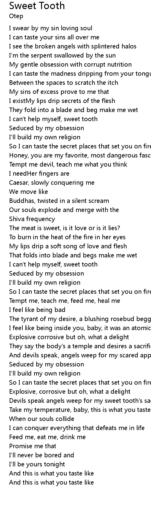 Devils speak angels weep for my sweet tooth's sacrifice |