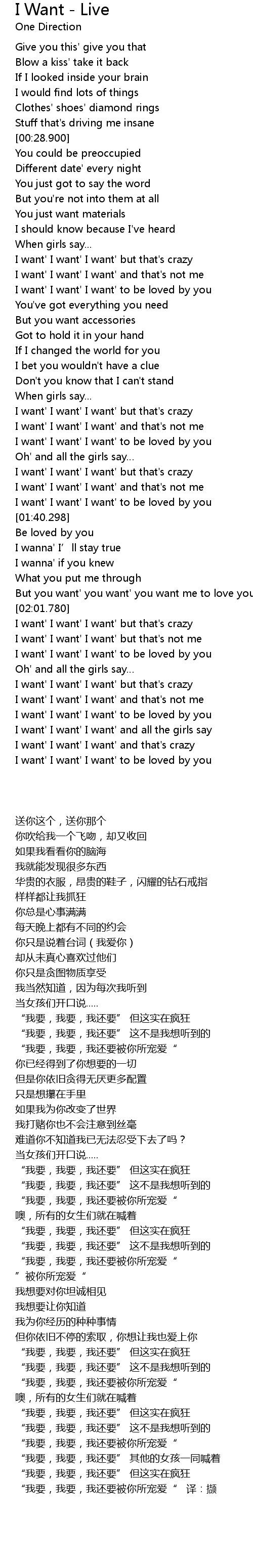 | [02:40.500] | I want' I want' I want' and that' s crazy |