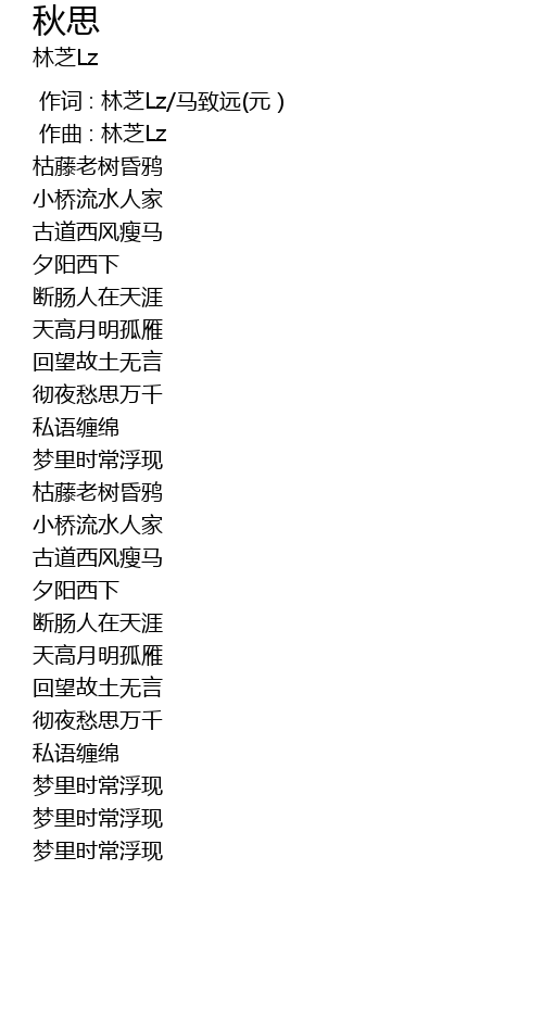 | [00:00.000] | 作词 : 林芝Lz/马致远(元) |