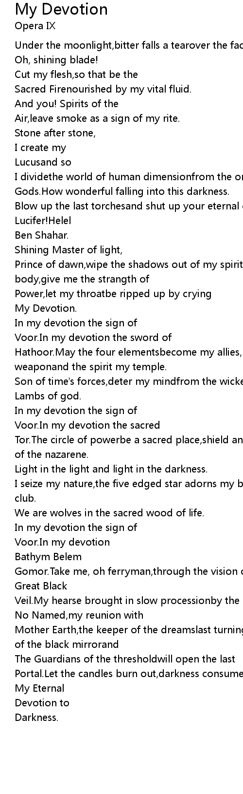 Hathoor.May the four elementsbecome my allies,may the faith of darknessbe my weaponand the spirit my temple. |