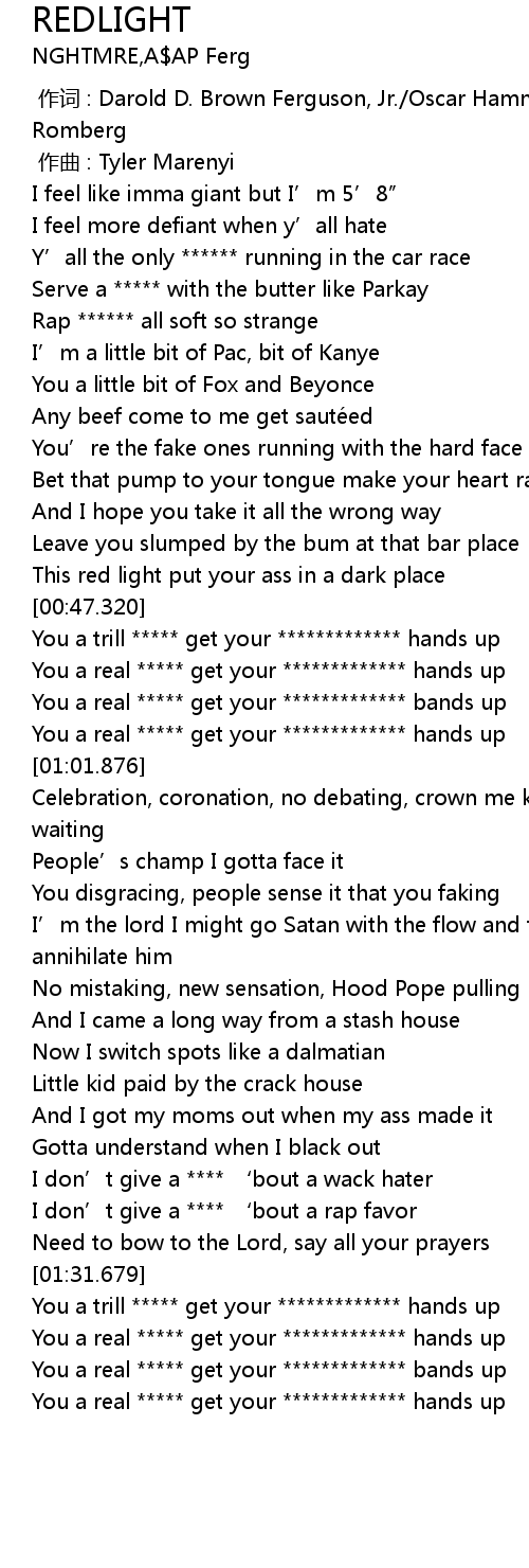 | [01:31.793] | You a trill ***** get your ************* hands up |