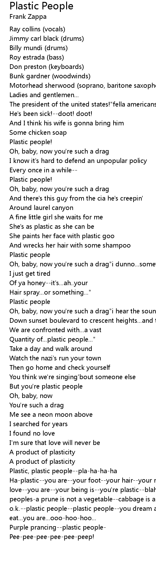 Ha-plastic--you are--your foot--your hair--your nose--your arms--you suck--you love--you are--your being is--you're plastic--blah--blah--blah--blah plastic peoples-a prune is not a vegetable--cabbage is a vegetable; makes it o.k.--plastic people--plastic people--you dream about...you think about...you eat...you are...ooo-hoo-hoo... |
