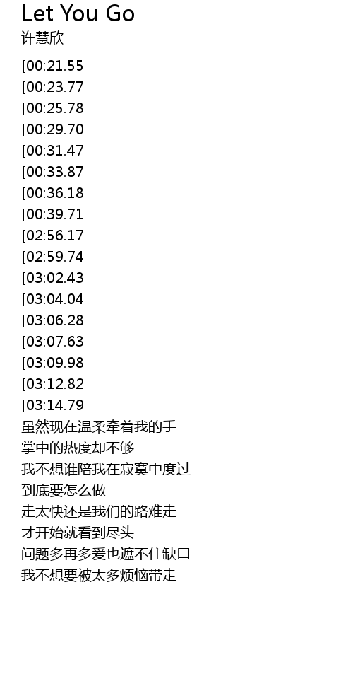 | [03:37.94][02:56.17][01:30.46][00:44.96] | Let You Go Let You Go |