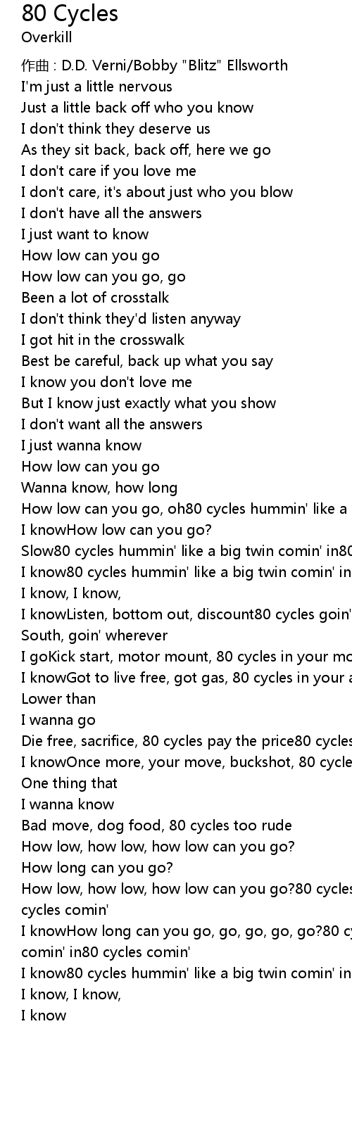 | How low can you go, oh80 cycles hummin' like a big twin comin'80 cycles comin' | |