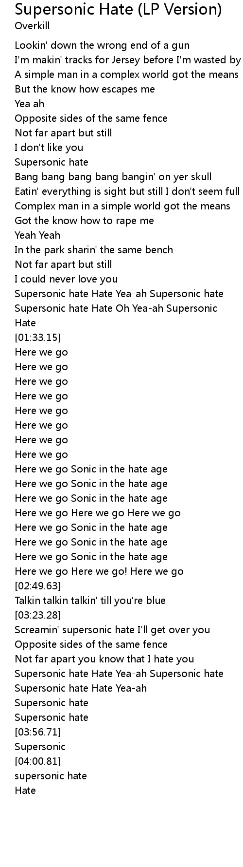 | [03:34.95] | Supersonic hate Hate Yea-ah Supersonic hate |