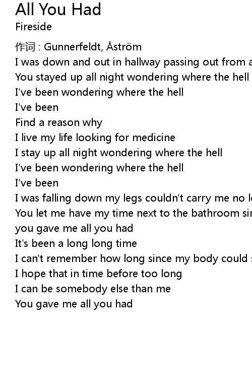 | You let me have my time next to the bathroom sink next to the bathroom sink and you gave me all you had | |