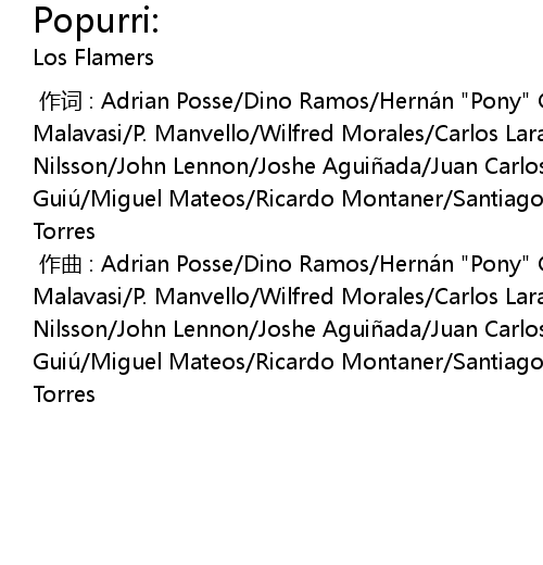 | [00:00.000] | zuo qu : Adrian Posse Dino Ramos Herna n " Pony" Gonza lez Mauro Malavasi P. Manvello Wilfred Morales Carlos Lara Chico Novarro Harry Nilsson John Lennon Joshe Agui ada Juan Carlos Calderon Maria Lar Memo Me ndez Guiu Miguel Mateos Ricardo Montaner Santiago Ausero n Ulises Hermosa Alvaro Torres |