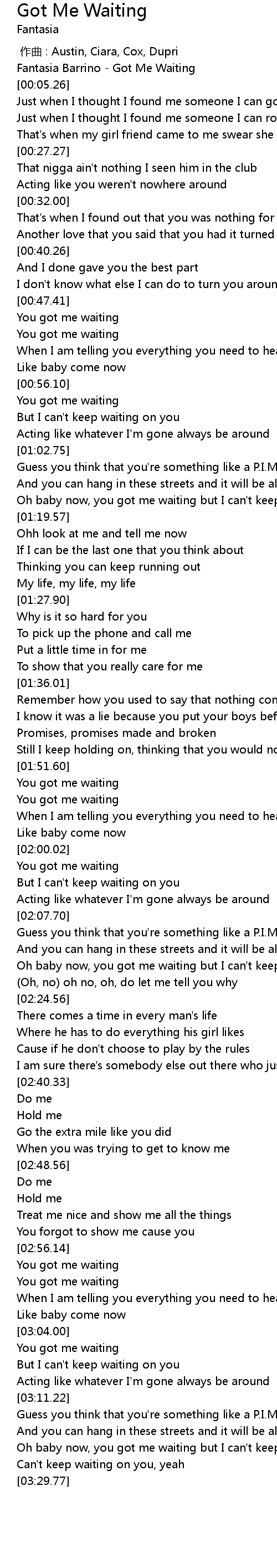 | [00:00.00] | Fantasia Barrino - Got Me Waiting |