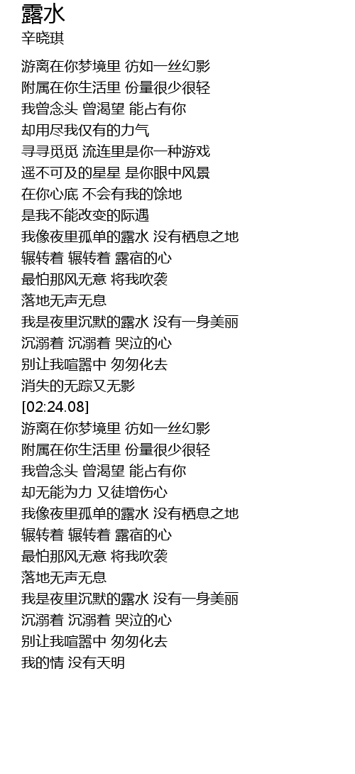 | [03:24.79] | wǒ shì yè lǐ chén mò de lù shuǐ méi yǒu yī shēn měi lì |