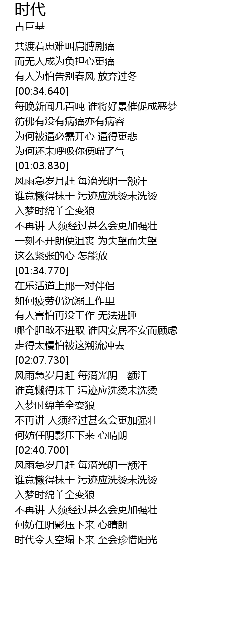 | [03:29.160] | 时代令天空塌下来 至会珍惜阳光 |