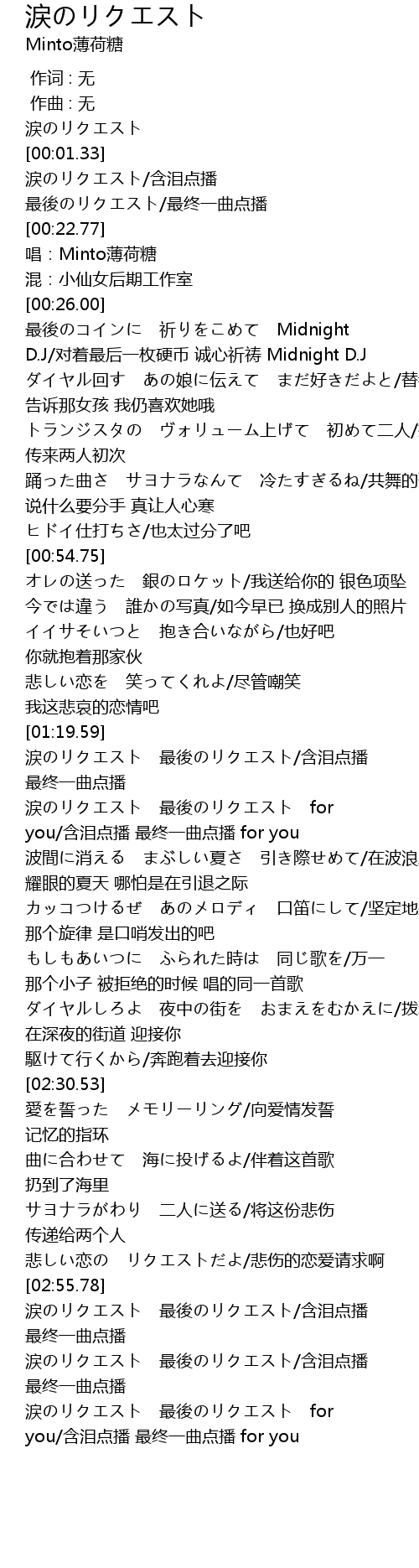 | [02:56.40] | 涙のリクエスト 最後のリクエスト/含泪点播 最终一曲点播 |