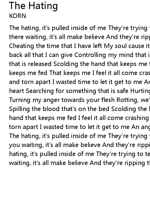 The hating, it's pulled inside of me They're trying to test my sanity It's in there waiting, it's all make believe And they're ripping the child within me Cheating the time that I have left My soul cause it's at the beginning Giving back all that I can give Controlling my mind that is disease Holding, my hate that is released Scolding the hand that keeps me fed That keeps me fed That keeps me fed That keeps me I feel it all come crashing down on me I feel alone and torn apart I wasted time to let it get to me An angry mouth with a broken heart Searching for something that is safe Hurting my pride that is detest Turning my anger towards your flesh Rotting, we're hoping ain't that bad Spilling the blood that's on the bed Scolding the hand that keeps me fed The hand that keeps me fed I feel it all come crashing down on me I feel alone and torn apart I wasted time to let it get to me An angry mouth with a broken heart The hating, it's pulled inside of me They're trying to test my sanity It's in you waiting, it's all make believe And they're ripping the child within me The hating, it's pulled inside of me They're trying to test my sanity It's in you waiting, it's all make believe And they're ripping the child within me No! |